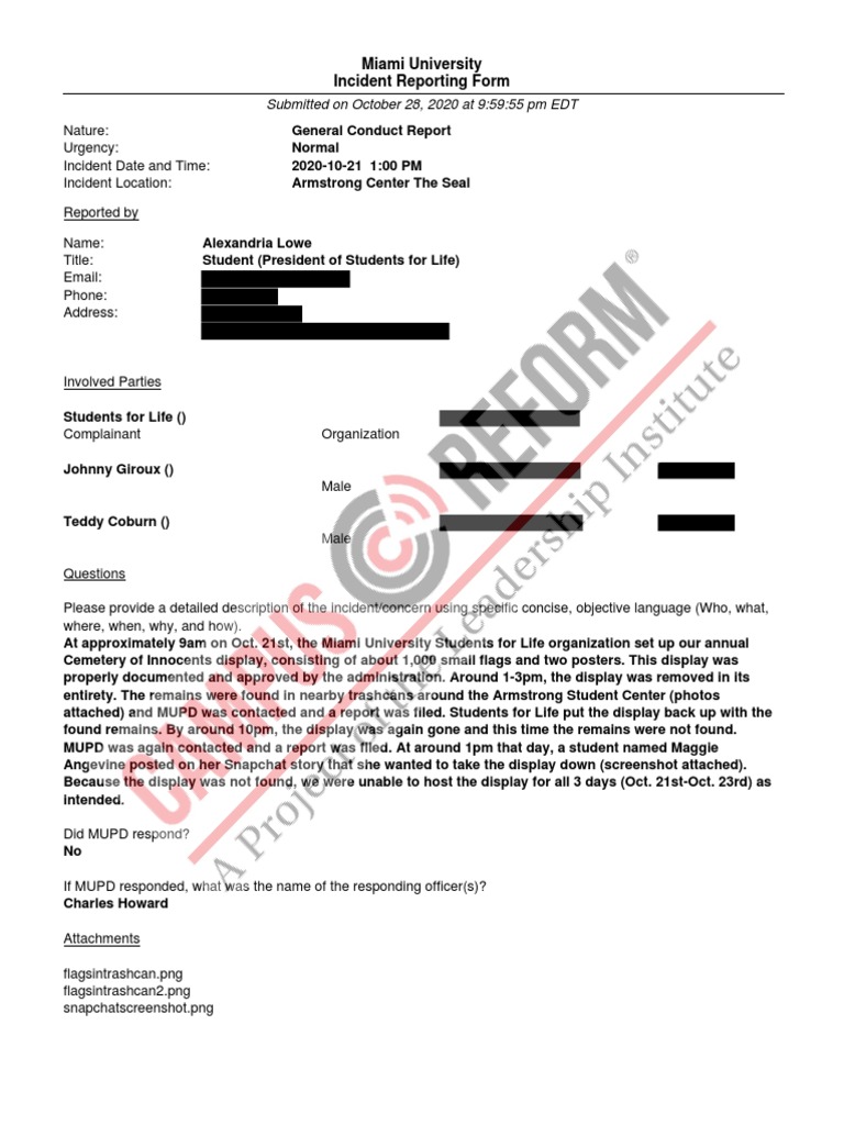 attached) and MUPD was contacted and a report was filed. Students for Life put the display back up with the