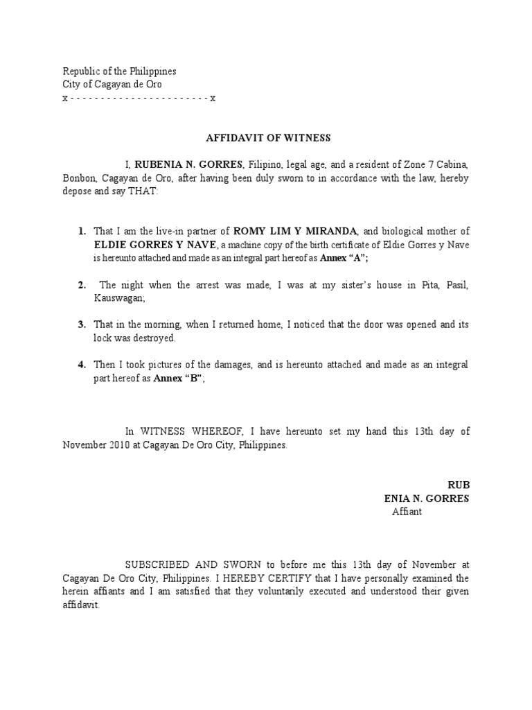 I, RUBENIA N. GORRES, Filipino, legal age, and a resident of Zone 7 Cabina,