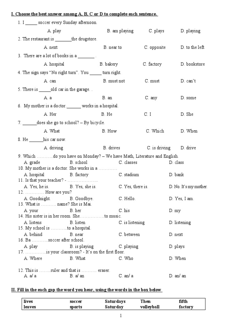 I. Choose the best answer among A, B, C or D to complete each sentence.