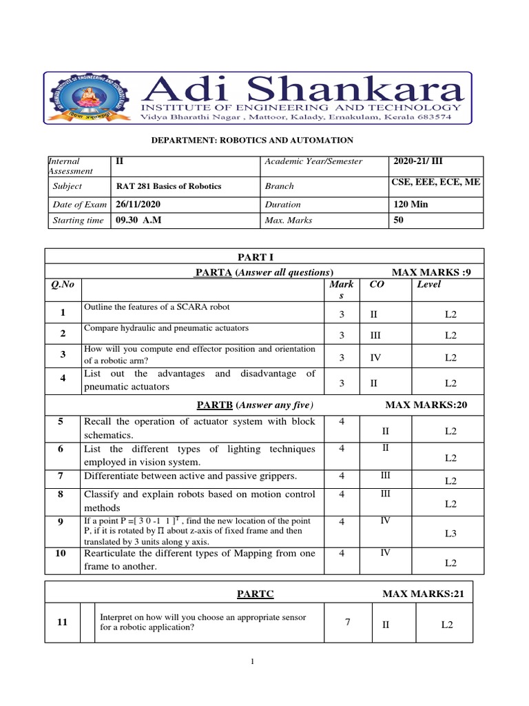 Subject RAT 281 Basics of Robotics Branch CSE, EEE, ECE, ME