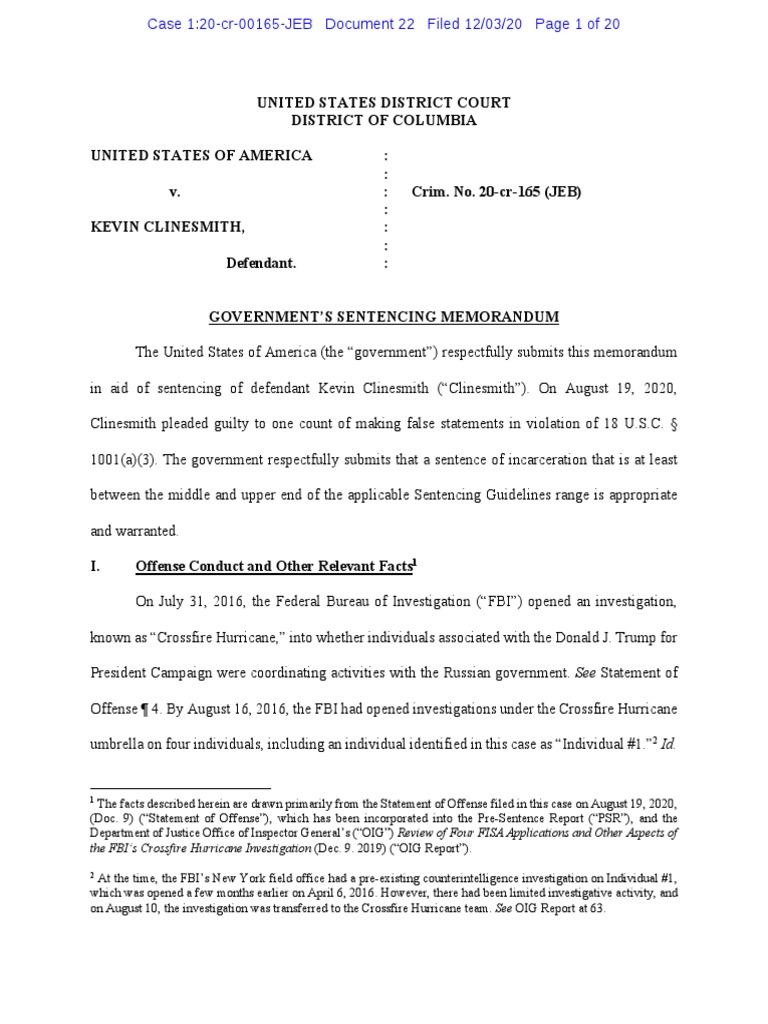 The United States of America (the “government”) respectfully submits this memorandum in aid of sentencing of defendant Kevin Clinesmith (“Clinesmith”). On August 19, 2020, Clinesmith pleaded guilty to one count of making false statements in violation of 18 U.S.C. § 1001(a)(3). The government respectfully submits that a sentence of incarceration that is at least between the middle and upper end of the applicable Sentencing Guidelines range is appropriate and warranted.