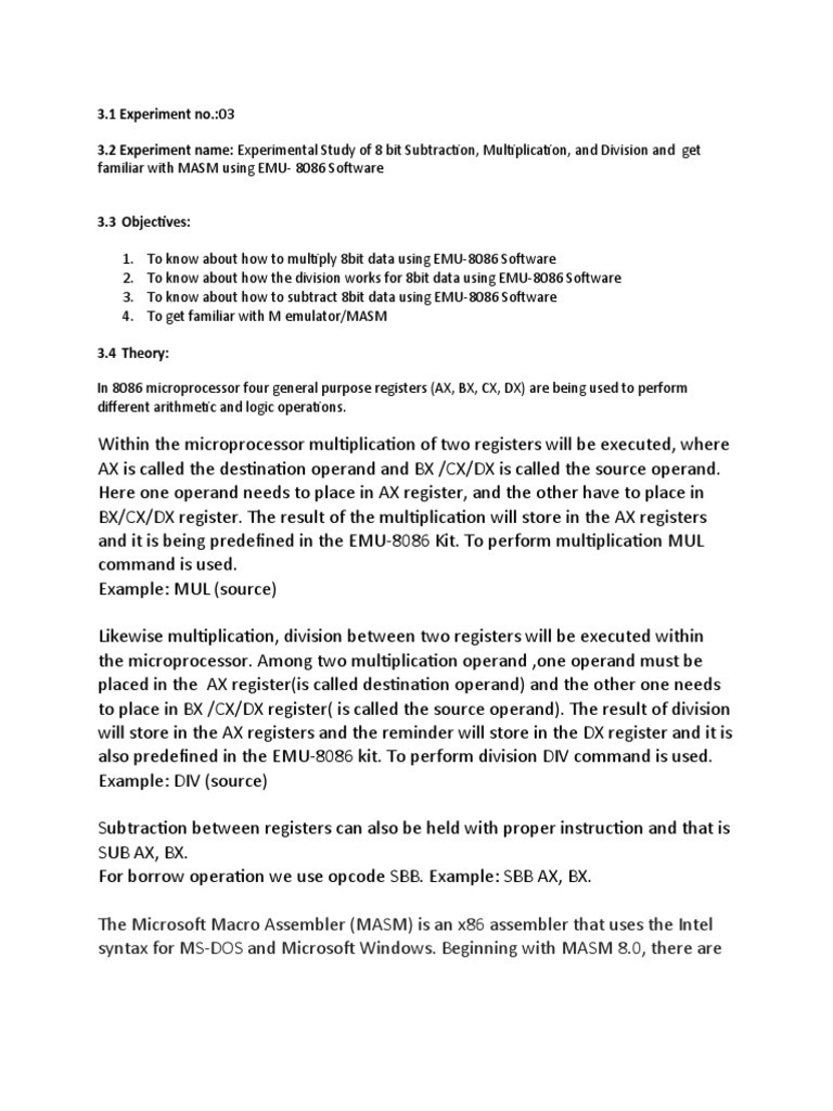 The experiment have been about the study of 8 bit division, multiplication, subtraction using EMU-8086
