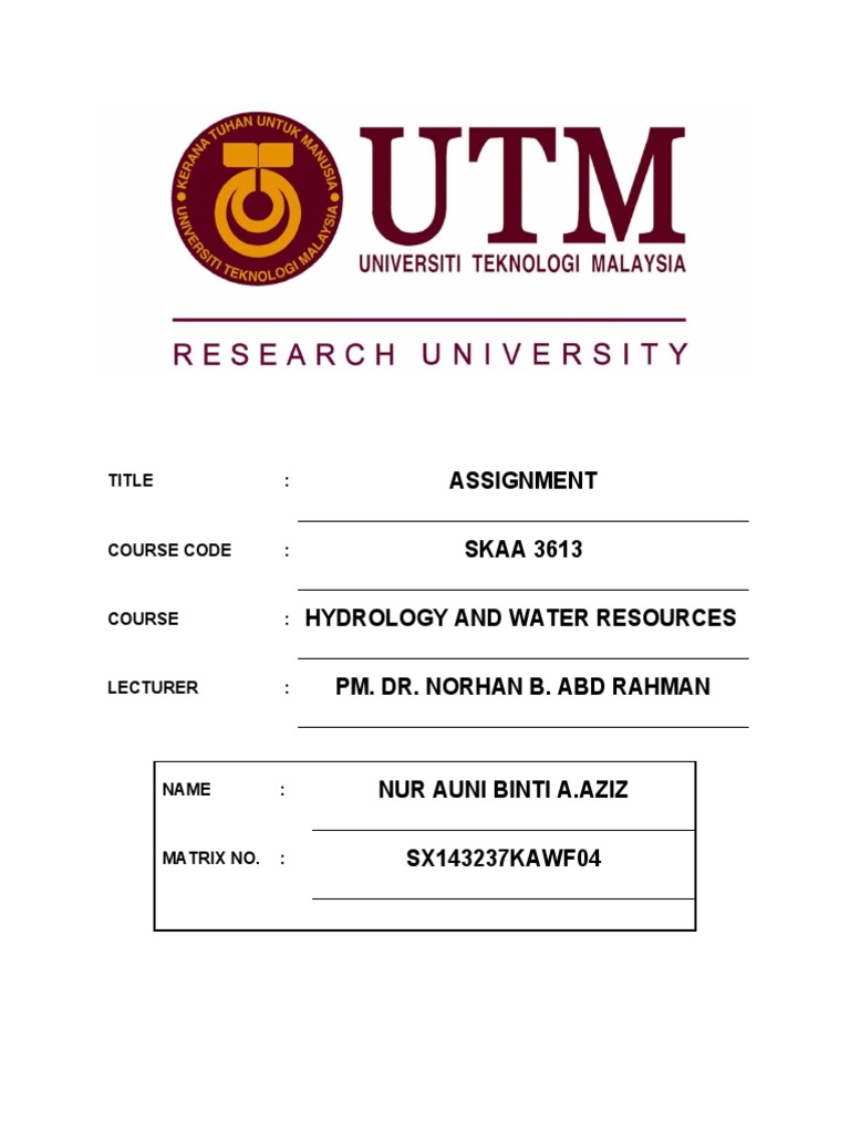 This document provides details for an assignment for the course Hydrology and Water Resources. The assignment pertains to student Nur Auni binti A.Aziz with matrix number SX143237KAWF04. The course code is SKAA 3613 and is being taught by Dr. Norhan B. Abd Rahman.