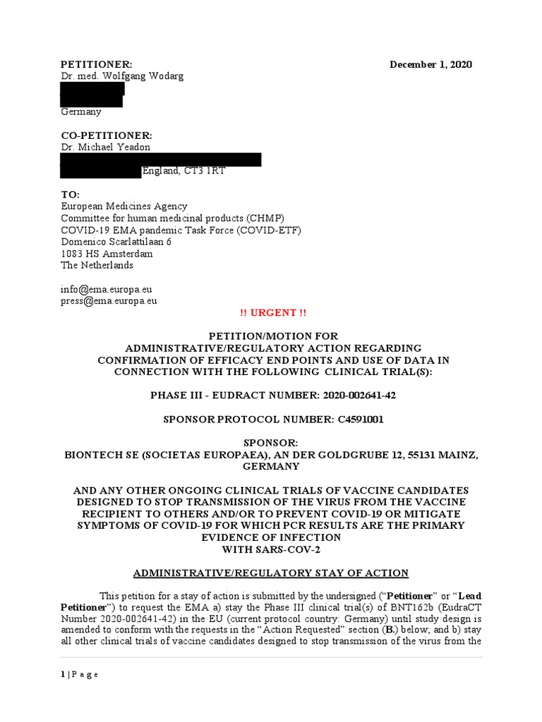 !! URGENT !! PETITION/MOTION FOR ADMINISTRATIVE/REGULATORY ACTION REGARDING CONFIRMATION OF EFFICACY END POINTS AND USE OF DATA IN CONNECTION WITH THE FOLLOWING CLINICAL TRIAL(S): PHASE III - EUDRACT NUMBER: 2020-002641-42 SPONSOR PROTOCOL NUMBER: C4591001 SPONSOR: BIONTECH SE (SOCIETAS EUROPAEA), AN DER GOLDGRUBE 12, 55131 MAINZ, GERMANY AND ANY OTHER ONGOING CLINICAL TRIALS OF VACCINE CANDIDATES DESIGNED TO STOP TRANSMISSION OF THE VIRUS FROM THE VACCINE RECIPIENT TO OTHERS AND/OR TO PREVENT COVID-19 OR MITIGATE SYMPTOMS OF COVID-19 FOR WHICH PCR RESULTS ARE THE PRIMARY EVIDENCE OF INFECTION WITH SARS-COV-2 ADMINISTRATIVE/REGULATORY STAY OF ACTION