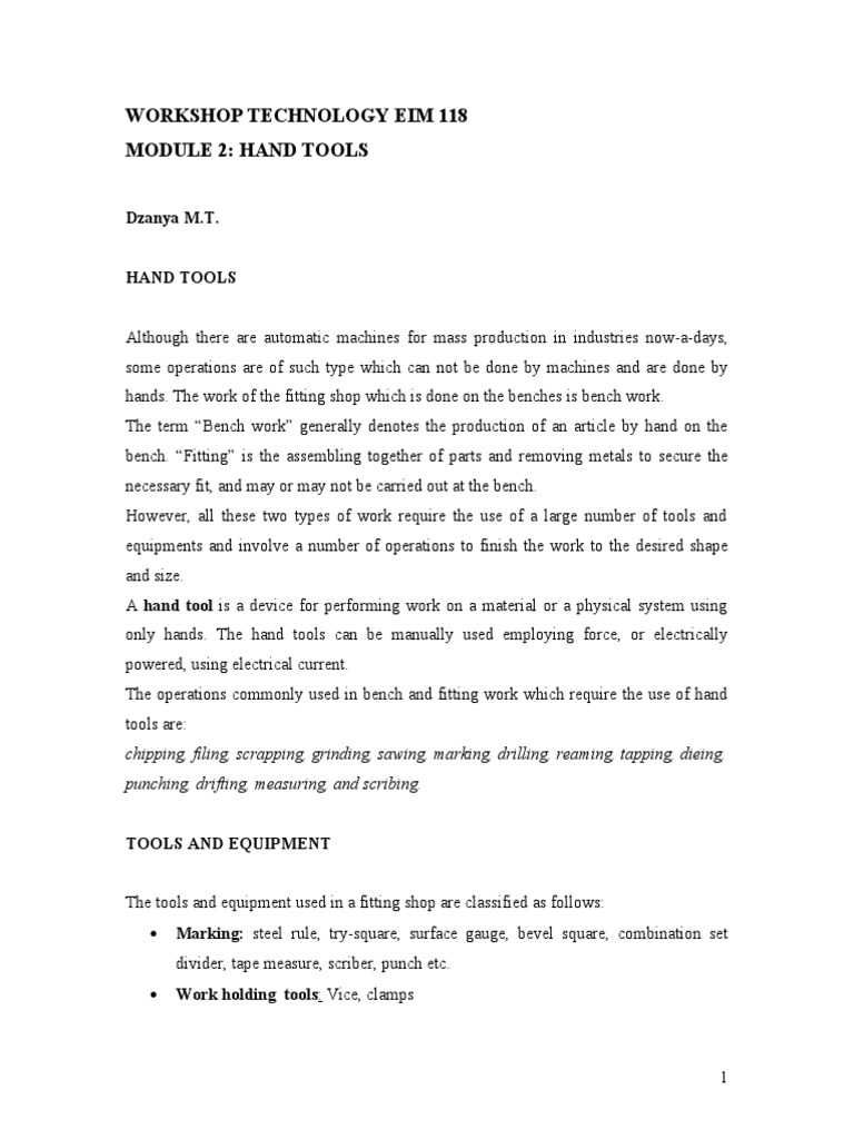 hands. The work of the fitting shop which is done on the benches is bench work.