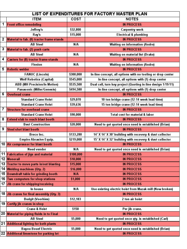 LIST OF EXPENDITURES FOR FACTORY MASTER PLAN