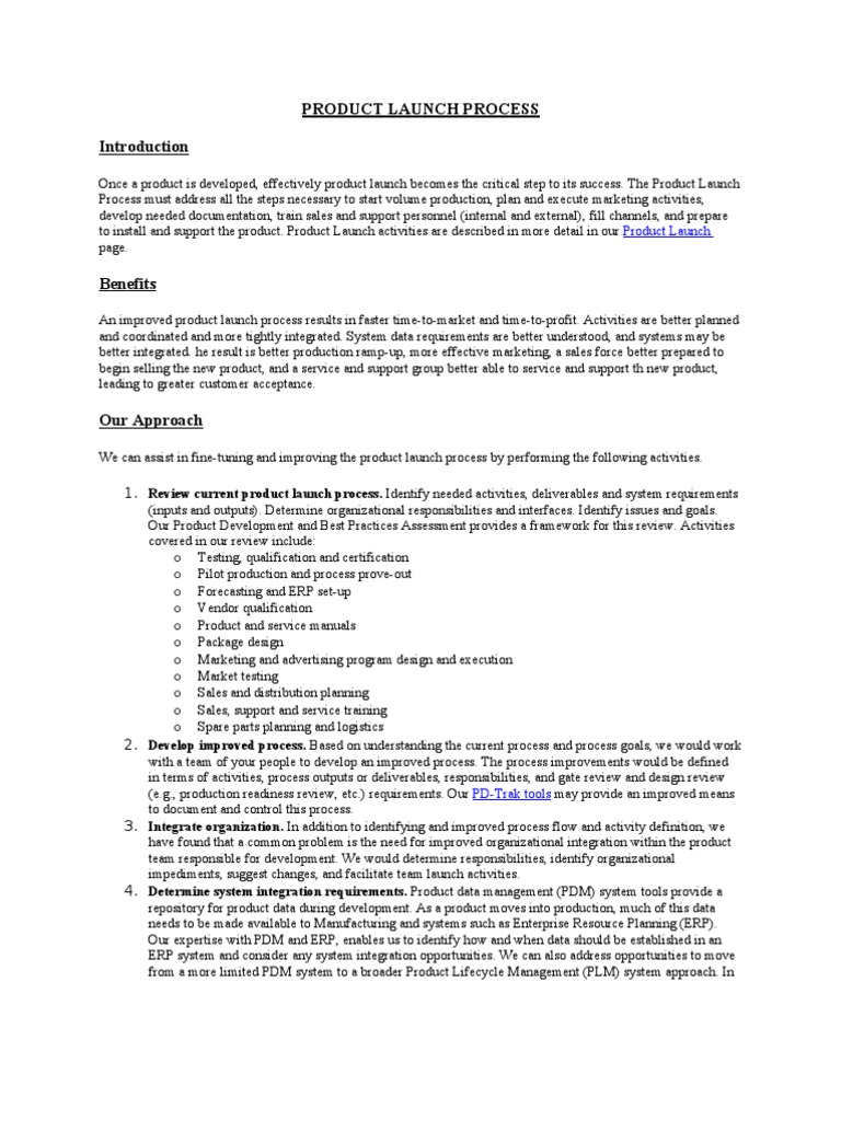1. Review current product launch process. Identify needed activities, deliverables and system requirements