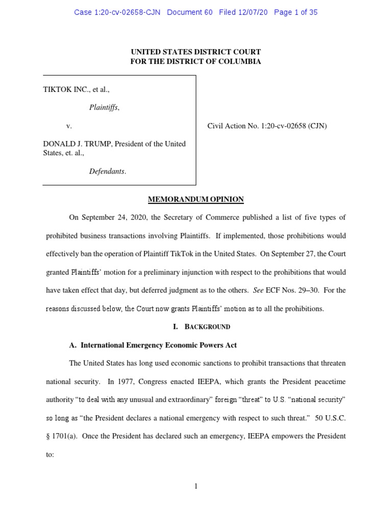 On September 24, 2020, the Secretary of Commerce published a list of five types of prohibited business transactions involving Plaintiffs. If implemented, those prohibitions would effectively ban the operation of Plaintiff TikTok in the United States. On September 27, the Court granted