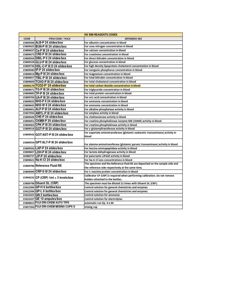 NX 500 REAGENTS CODES