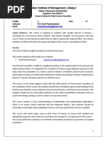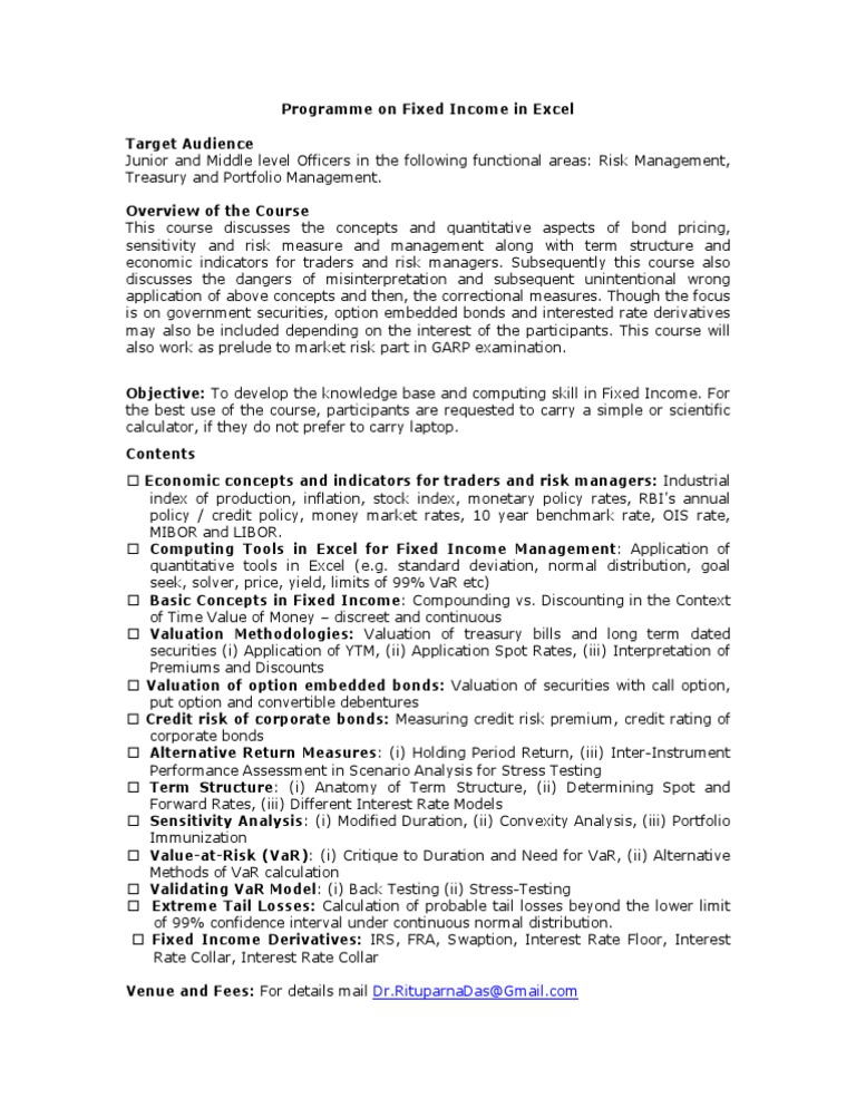Objective: To develop the knowledge base and computing skill in Fixed Income. For