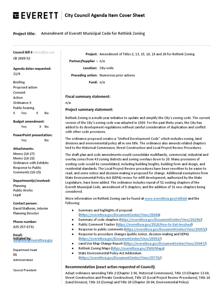 version of the City’s zoning code was adopted in 1989. For the past thirty years, the City has added to its development regulations without careful consideration of duplication and conflict with other code provisions. The ordinance proposed creates a “Unified Development Code” which includes zoning, land divisions and environmental policy all in one title. The ordinance also amends related chapters tied to the Historical Commission, Street Construction and Local Project Review Procedures. The draft plan and code amendments would consolidate multifamily, commercial, industrial and overlay zones from 43 zoning districts and zoning overlays down to 20. Many provisions of existing code would be consolidated, including building heights, building form and design, and residential standards. The Local Project Review procedures have been rewritten to be easier to read, and some notice and decision-making is proposed for change. Additional exemptions from State Environmental Policy Act (SEPA) review for infill development, authorized by the State Legislature, have been added. The ordinance includes repeal of 51 existing chapters of the Everett Municipal Code, amendment of 5 chapters, and the addition of 31 new chapters being considered. More information on Rethink Zoning can be found at www.everettwa.gov/rethink and the