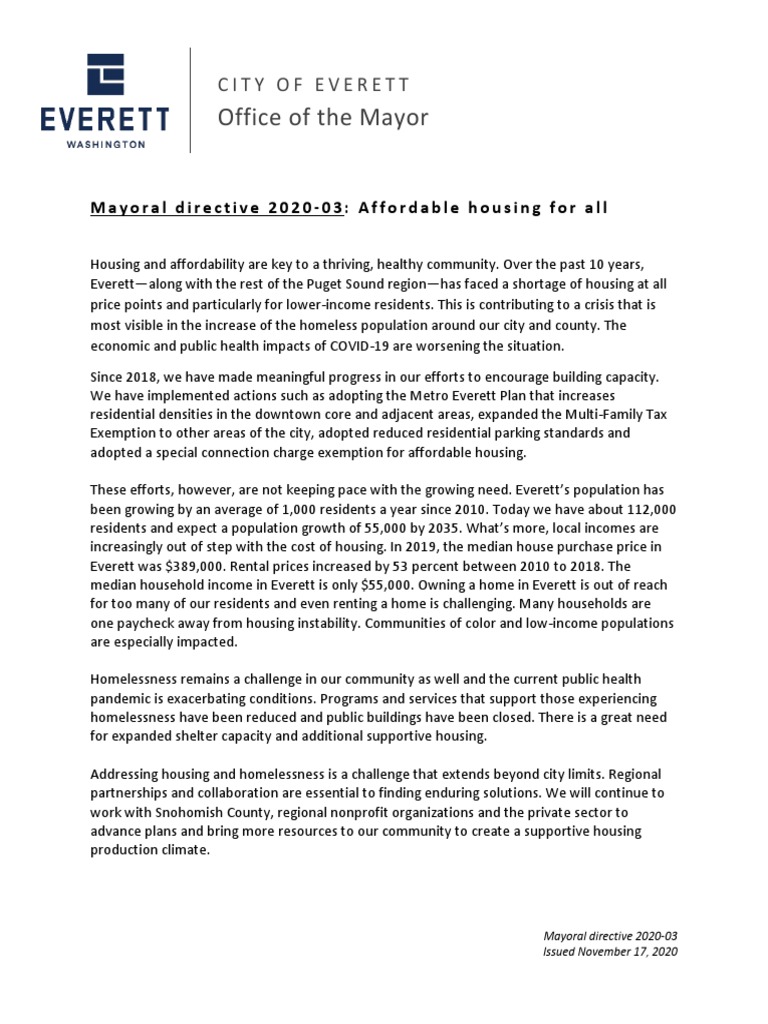 are key to a thriving, healthy community. Over the past 10 years, Everett—along with the rest of the Puget Sound region—has faced a shortage of housing at all price points and particularly for lower-income residents. This is contributing to a crisis that is most visible in the increase of the homeless population around our city and county. The economic and public health impacts of COVID-19 are worsening the situation. Since 2018, we have made meaningful progress in our efforts to encourage building capacity. We have implemented actions such as adopting the Metro Everett Plan that increases residential densities in the downtown core and adjacent areas, expanded the Multi-Family Tax Exemption to other areas of the city, adopted reduced residential parking standards and adopted a special connection charge exemption for affordable housing. These efforts, however, are not keeping pace with the growing need. Everett’s population has been growing by an average of 1,000 residents a year since 2010. Today we have about 112,000 residents and expect a population growth of 55,000 by 2035. What’s more, local incomes are increasingly out of step with the cost of housing. In 2019, the median house purchase price in Everett was $389,000. Rental prices increased by 53 percent between 2010 to 2018. The median household income in Everett is only $55,000. Owning a home in Everett is out of reach for too many of our residents and even renting a home is challenging. Many households are one paycheck away from housing instability. Communities of color and low-income populations are especially impacted. Homelessness remains a challenge in our community as well and the current public health pandemic is exacerbating conditions. Programs and services that support those experiencing homelessness have been reduced and public buildings have been closed. There is a great need for expanded shelter capacity and additional supportive housing. Addressing housing and homelessness is a challenge that extends beyond city limits. Regional partnerships and collaboration are essential to finding enduring solutions. We will continue to work with Snohomish County, regional nonprofit organizations and the private sector to advance plans and bring more resources to our community to create a supportive housing production climate.
