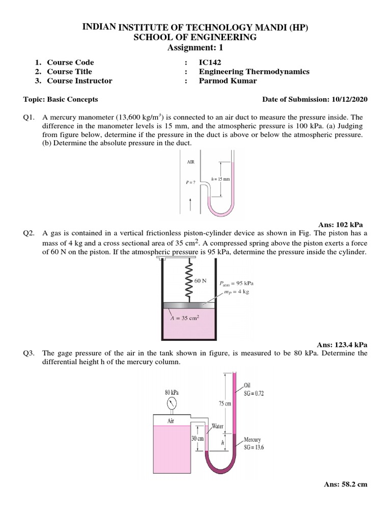 Q1. A mercury manometer (13,600 kg/m3) is connected to an air duct to measure the pressure inside. The