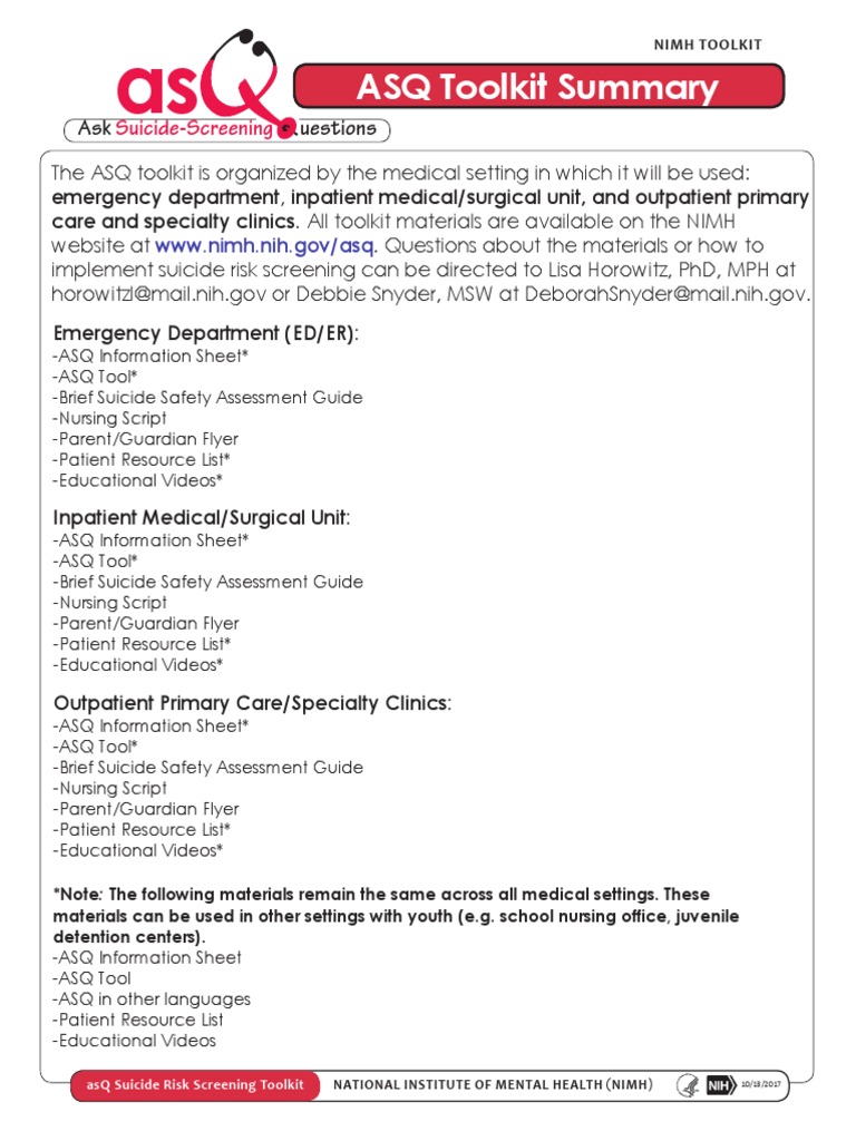asQ Suicide Risk Screening Toolkit NATIONAL INSTITUTE OF MENTAL HEALTH (NIMH) 10/13/2017