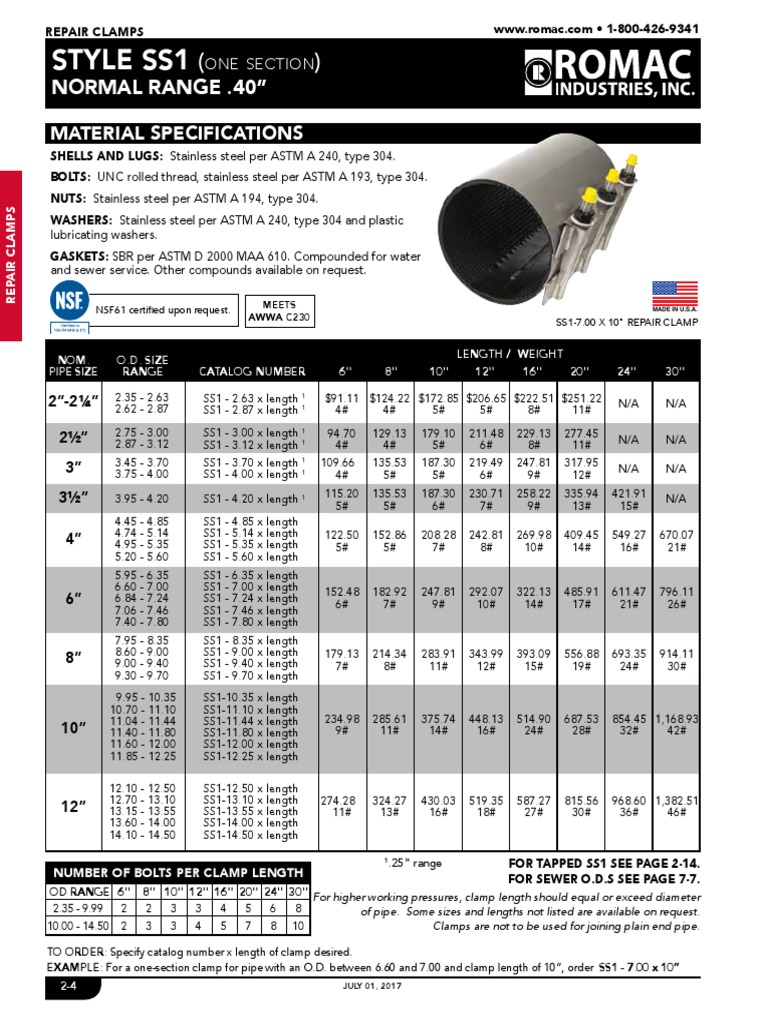 EXAMPLE: For a one-section clamp for pipe with an O.D. between 6.60 and 7.00 and clamp length of 10”, order SS1 - 7.00 x 10”