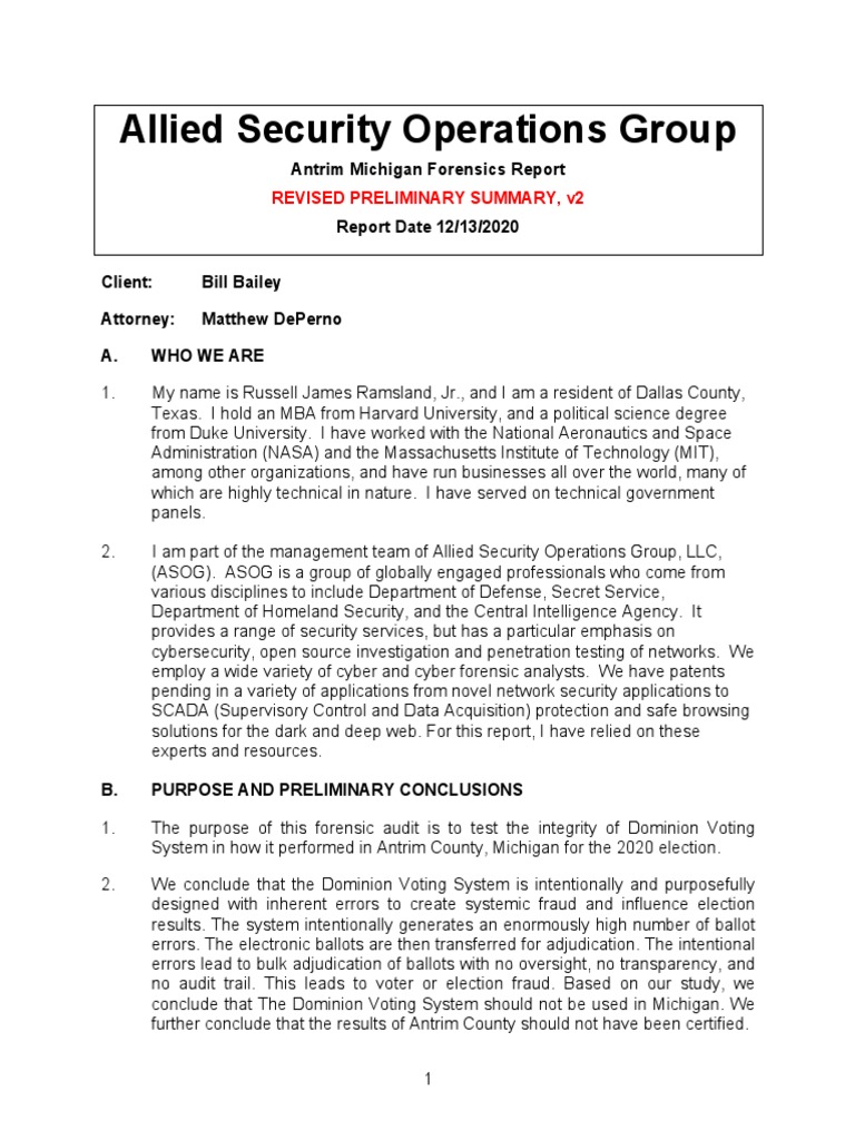 1. My name is Russell James Ramsland, Jr., and I am a resident of Dallas County, Texas. I hold an MBA from Harvard University, and a political science degree from Duke University. I have worked with the National Aeronautics and Space Administration (NASA) and the Massachusetts Institute of Technology (MIT), among other organizations, and have run businesses all over the world, many of which are highly technical in nature. I have served on technical government panels. 2. I am part of the management team of Allied Security Operations Group, LLC, (ASOG). ASOG is a group of globally engaged professionals who come from various disciplines to include Department of Defense, Secret Service, Department of Homeland Security, and the Central Intelligence Agency. It provides a range of security services, but has a particular emphasis on cybersecurity, open source investigation and penetration testing of networks. We employ a wide variety of cyber and cyber forensic analysts. We have patents pending in a variety of applications from novel network security applications to SCADA (Supervisory Control and Data Acquisition) protection and safe browsing solutions for the dark and deep web. For this report, I have relied on these experts and resources.