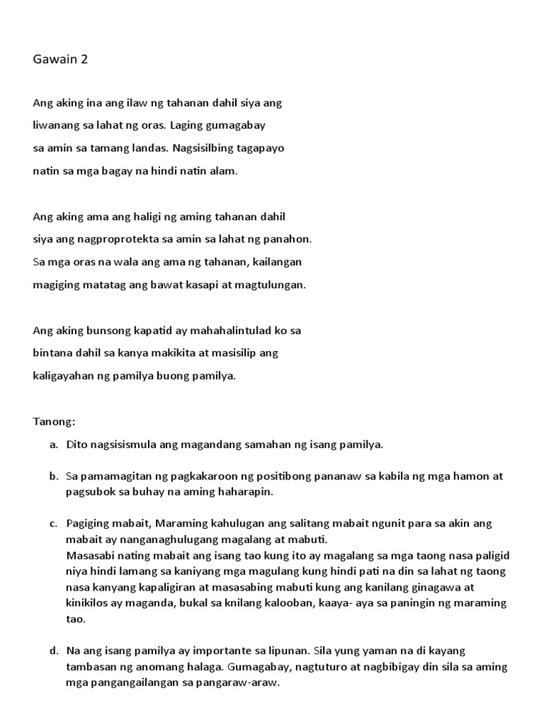 a. Ang pamilya ay mga taong nagmamahal at nag-aalaga sayo simula sa pagkabata. Ang