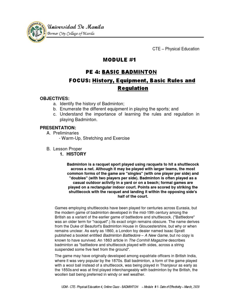 UDM - CTE- Physical Education 4, Online Class - BADMINTON – Module # 1- Date of Effectivity – March, 2020