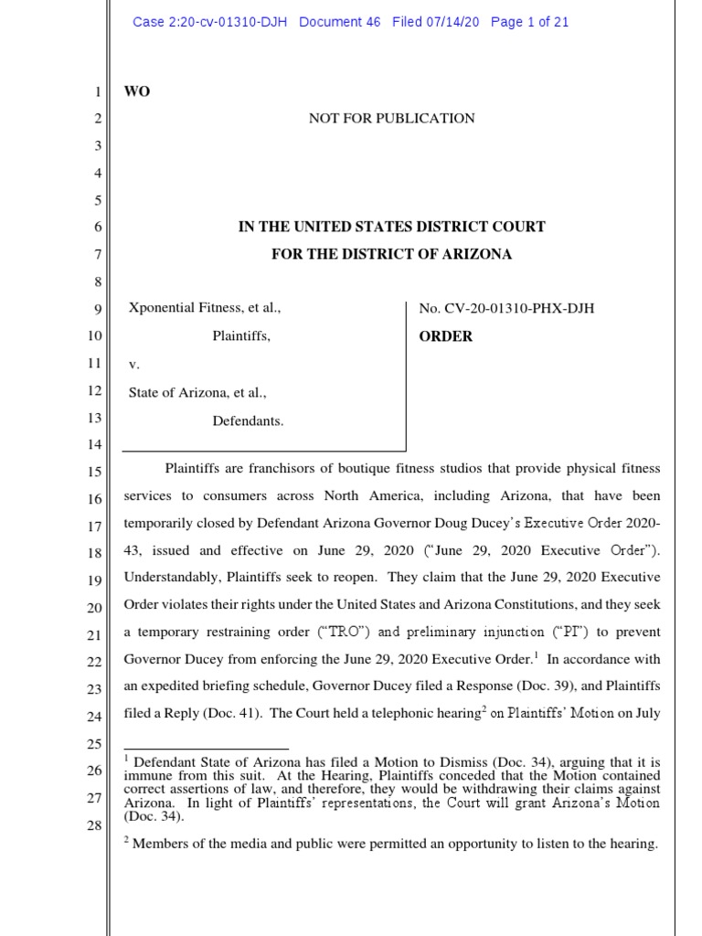 Plaintiffs are franchisors of boutique fitness studios that provide physical fitness services to consumers across North America, including Arizona, that have been temporarily closed by Defendant Arizona Governor Doug Ducey