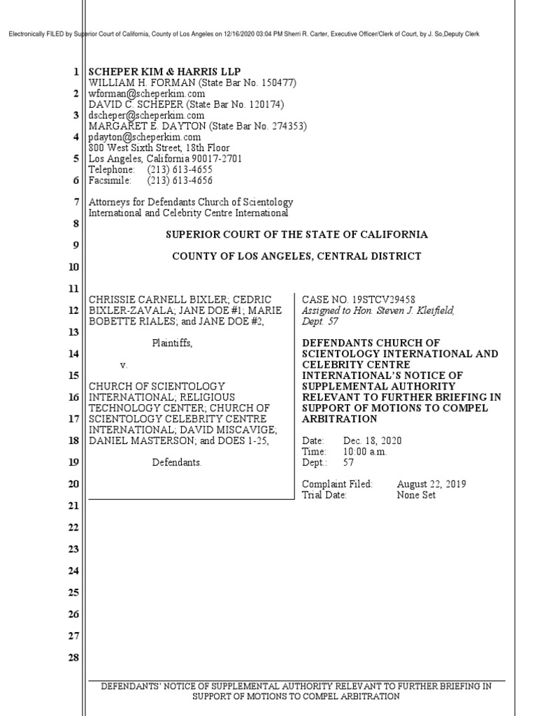 bears on the issues addressed at Plaintiffs’ Supplemental Brief in Opposition to Defendants’ Motions To Compel Religious Arbitration at pages 2:23 and 5:13-17 and Defendants’ Reply In Support of Further Briefing in Support of Motions to Compel Religious Arbitration at page 6:9-13. DATED: December 16, 2020 SCHEPER KIM & HARRIS LLP WILLIAMH.FORMANDAVID C. SCHEPER MARGARET E. DAYTON By: William H. Forman Attorneys for Defendants Church of Scientology International and Celebrity Centre International