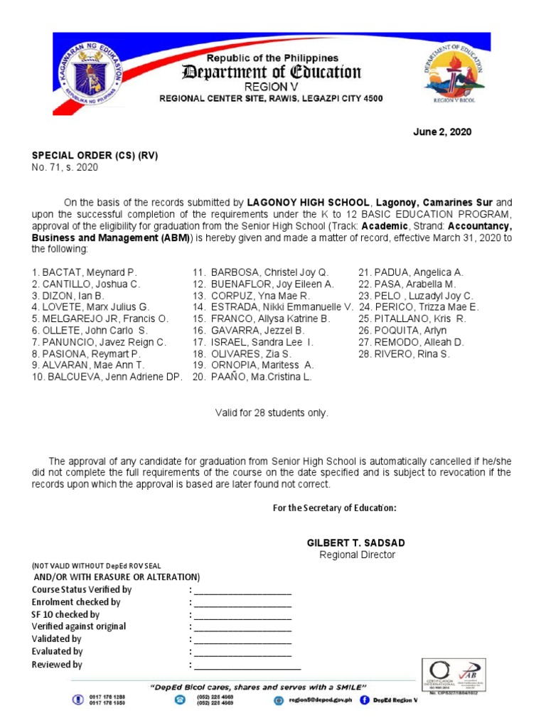 On the basis of the records submitted by LAGONOY HIGH SCHOOL, Lagonoy, Camarines Sur and