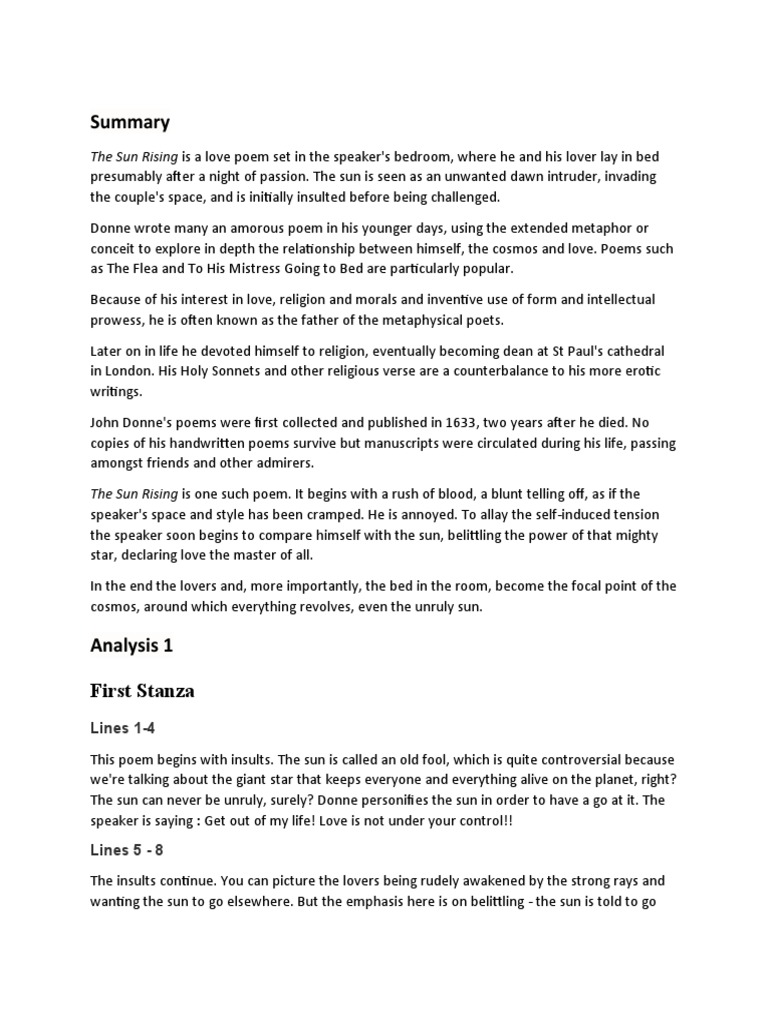 holiness in “The Sun Rising” with the line “Thy beams so reverend, and strong.” Donne is setting