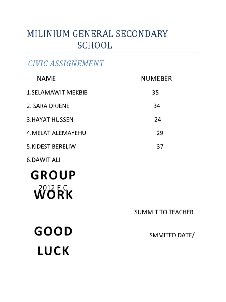 This document appears to be an assignment from Milinium General Secondary School listing the names, student numbers, and group of 6 students. It also mentions a civic assignment related to submitting work to a teacher and wishes them good luck.