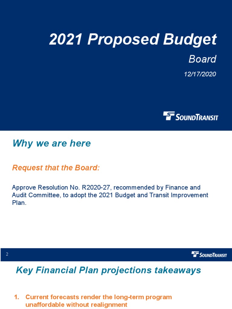 Approve Resolution No. R2020-27, recommended by Finance and Audit Committee,to adopt the 2021 Budget and Transit Improvement Plan.