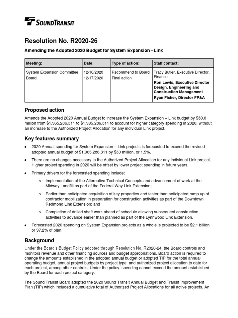 NOW THEREFORE BE IT RESOLVED by the Board of the Central Puget Sound Regional Transit Authority that the Adopted 2020 Annual Budget is amended to increase the System Expansion