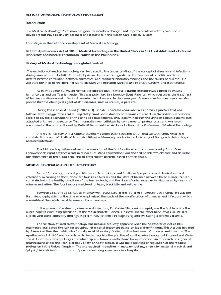460 BC. Apothecaries Act of 1815 . Medical technology in the United States in 1871, establishment of clinical