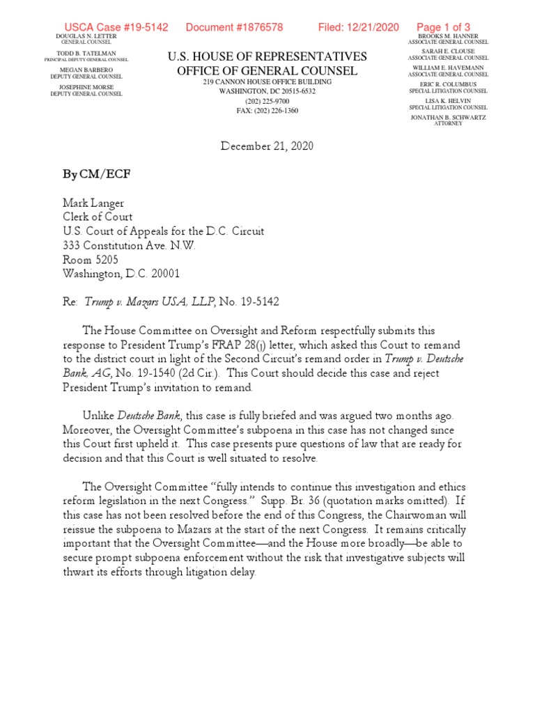 reissue the subpoena to Mazars at the start of the next Congress. It remains critically