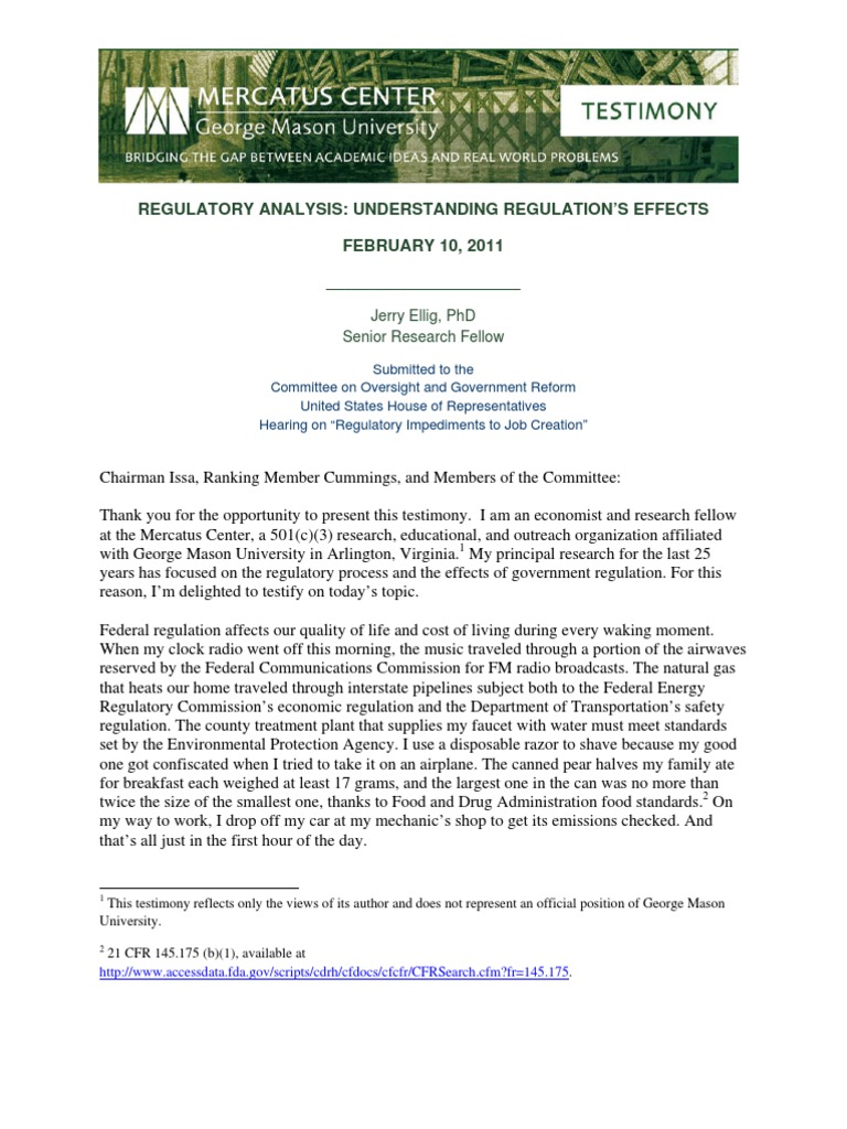The subject of today’s hearing is regulation’s effect on jobs. The Mercatus Center’s director of