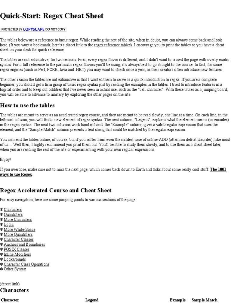 beginner, you should get a firm grasp of basic regex syntax just by reading the examples in the tables. I tried to introduce features in a