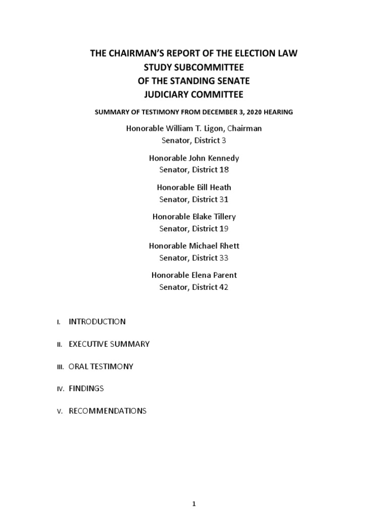 The charge assigned to the Election Law Study Subcommittee of the Standing Senate Judiciary Committee was to examine the recent election cycle, the recount process, the audit process, the current investigations taking place, the litigation that is moving forward, as well as address issues relating to the upcoming runoffs. In the matter of the law itself, we were to also consider