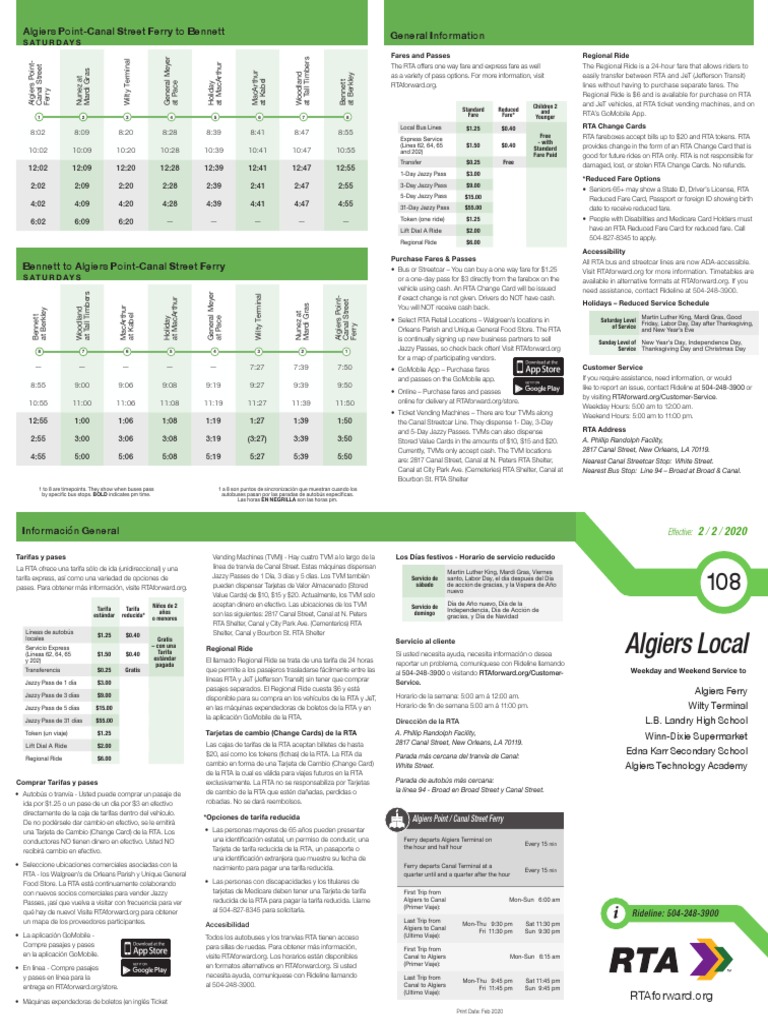 en la aplicación GoMobile. visite RTAforward.org. Los horarios están disponibles Canal to Algiers Mon-Sun 6:15 am
