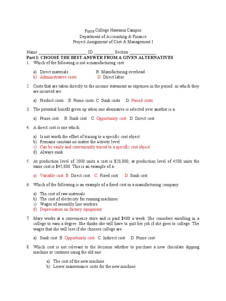 Part I: CHOOSE THE BEST ANSWER FROM A GIVEN ALTERNATIVES