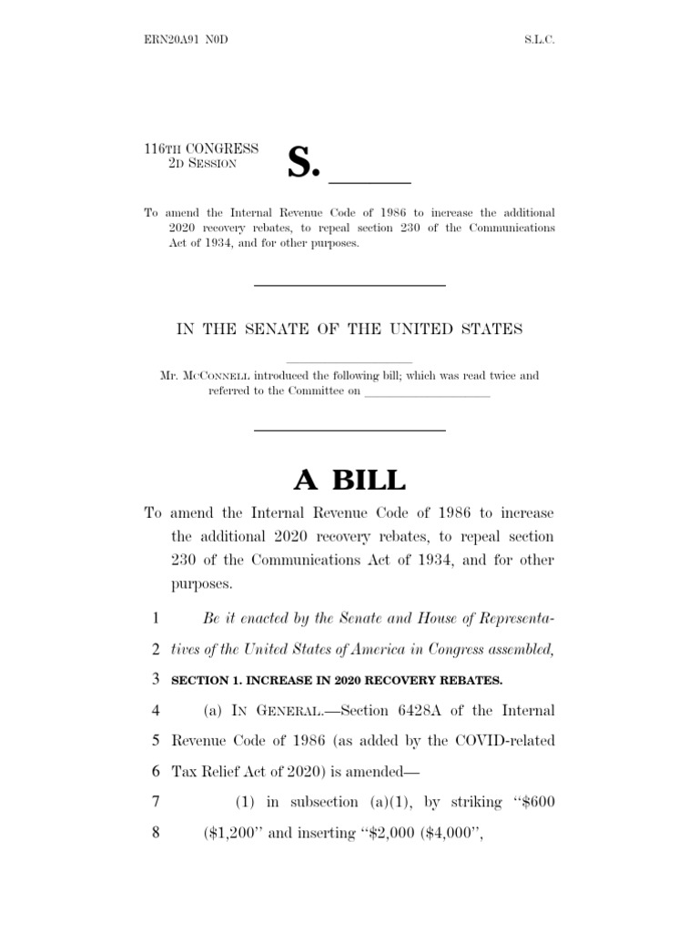 To amend the Internal Revenue Code of 1986 to increase the additional 2020 recovery rebates, to repeal section 230 of the Communications Act of 1934, and for other purposes.