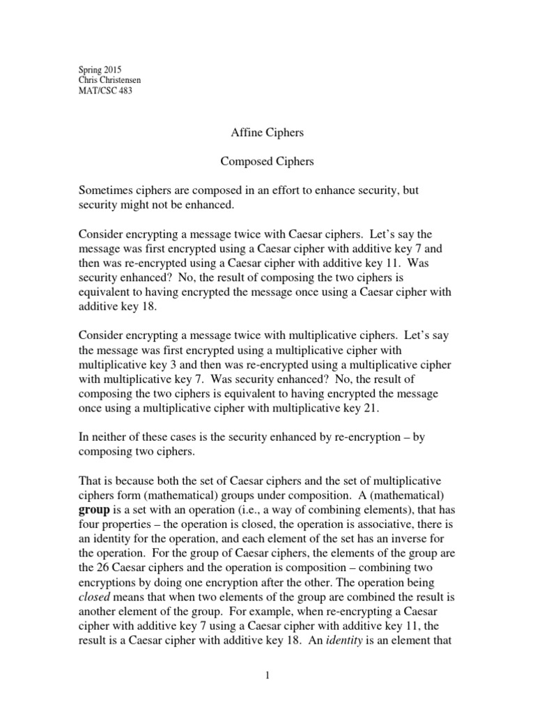 multiplicative cipher and then by a Caesar cipher (or vice versa). Such