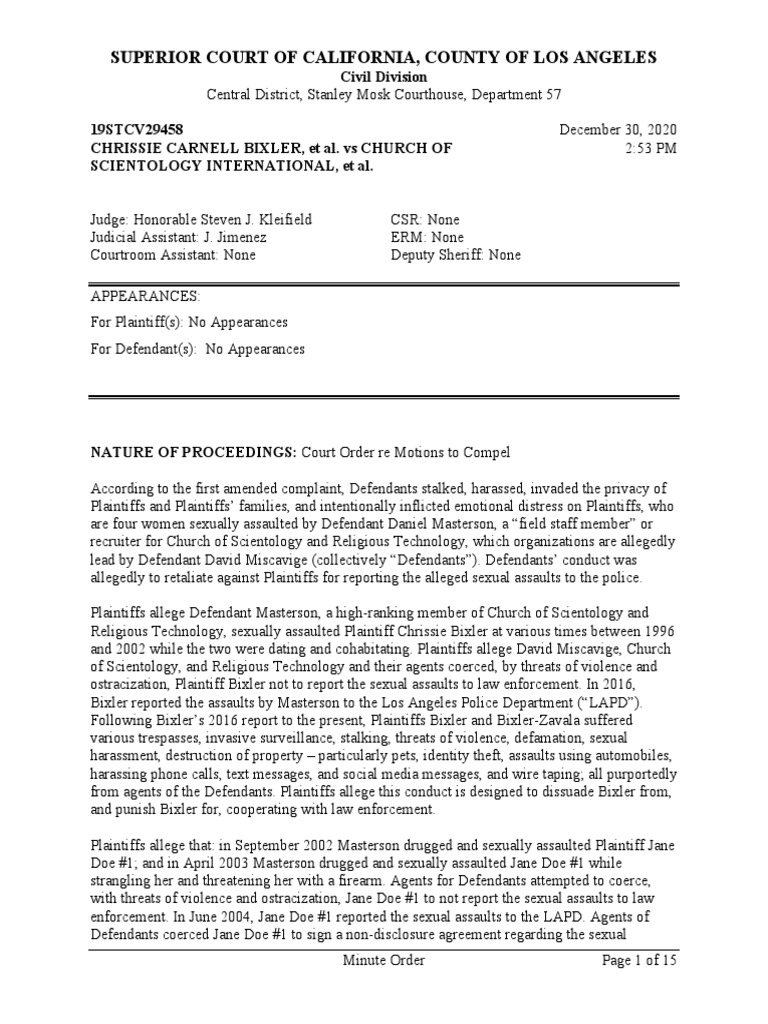Court Order re Motions to CompelAccording to the first amended complaint, Defendants stalked, harassed, invaded the privacy of Plaintiffs and Plaintiffs’ families, and intentionally inflicted emotional distress on Plaintiffs, who are four women sexually assaulted by Defendant Daniel Masterson, a “field staff member” or recruiter for Church of Scientology and Religious Technology, which organizations are allegedly lead by Defendant David Miscavige (collectively “Defendants”). Defendants’ conduct was allegedly to retaliate against Plaintiffs for reporting the alleged sexual assaults to the police. Plaintiffs allege Defendant Masterson, a high-ranking member of Church of Scientology and Religious Technology, sexually assaulted Plaintiff Chrissie Bixler at various times between 1996 and 2002 while the two were dating and cohabitating. Plaintiffs allege David Miscavige, Church of Scientology, and Religious Technology and their agents coerced, by threats of violence and ostracization, Plaintiff Bixler not to report the sexual assaults to law enforcement. In 2016, Bixler reported the assaults by Masterson to the Los Angeles Police Department (“LAPD”). Following Bixler’s 2016 report to the present, Plaintiffs Bixler and Bixler-Zavala suffered various trespasses, invasive surveillance, stalking, threats of violence, defamation, sexual harassment, destruction of property – particularly pets, identity theft, assaults using automobiles, harassing phone calls, text messages, and social media messages, and wire taping; all purportedly from agents of the Defendants. Plaintiffs allege this conduct is designed to dissuade Bixler from, and punish Bixler for, cooperating with law enforcement. Plaintiffs allege that: in September 2002 Masterson drugged and sexually assaulted Plaintiff Jane Doe #1; and in April 2003 Masterson drugged and sexually assaulted Jane Doe #1 while strangling her and threatening her with a firearm. Agents for Defendants attempted to coerce, with threats of violence and ostracization, Jane Doe #1 to not report the sexual assaults to law enforcement. In June 2004, Jane Doe #1 reported the sexual assaults to the LAPD. Agents of Defendants coerced Jane Doe #1 to sign a non-disclosure agreement regarding the sexual