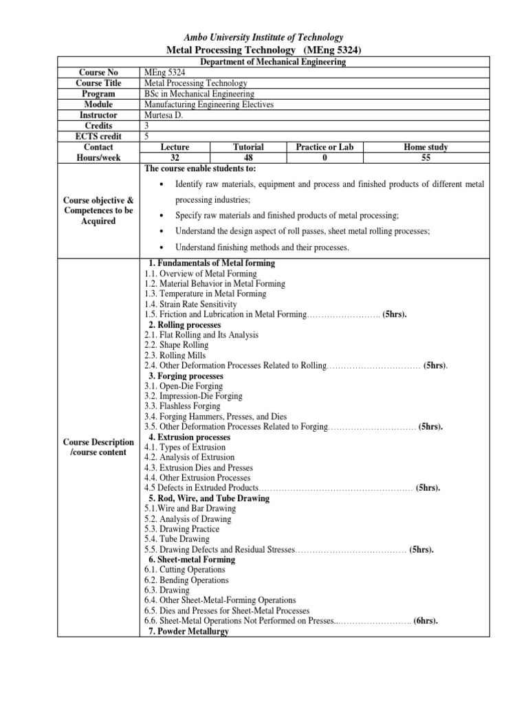 Course Title Metal Processing Technology