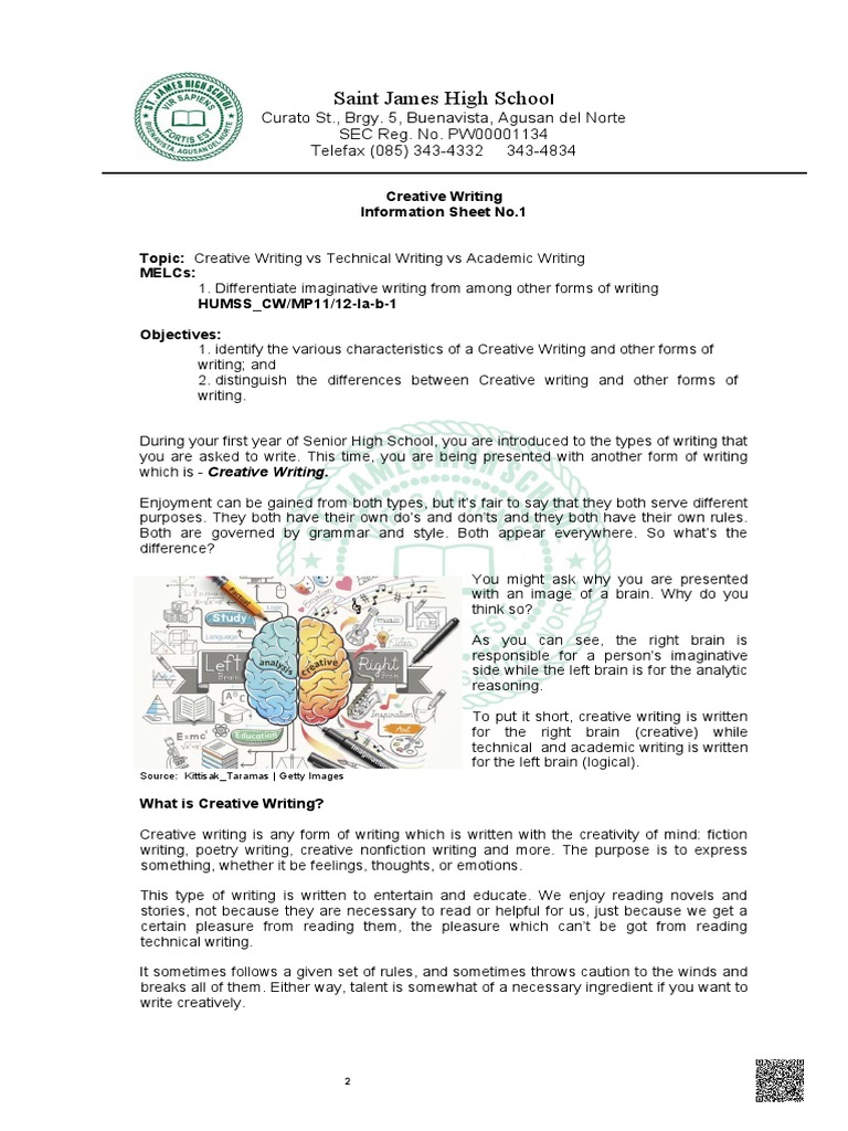 I. Fill in the matrix below with the information on what Creative Writing, Technical