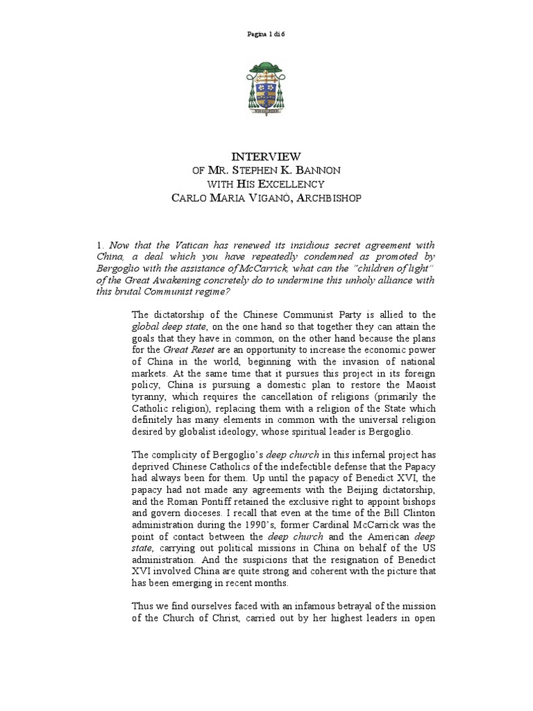 conflict with those members of the Chinese Catholic undergroundhierarchy who have remained faithful to Our Lord and to His Church.My affectioned thoughts and prayers are with them and with CardinalZen, an eminent confessor of the faith, whom Bergoglio recentlyshamefully refused to receive.We believers must act on the spiritual level by fervent prayer, askingGod to give special protection to the Church in China, and also bycontinually denouncing the aberrations carried out by the Chineseregime. This action must be accompanied by a work of raisingawareness within governments and international institutions that havenot been compromised by the Chinese communist dictatorship, so thatthe violations of human rights and the attacks on the freedom of theCatholic Church in China may be denounced and punished withsanctions and strong diplomatic pressure. And this is the line thatPresident Trump is pursuing with decisive courage. Beijing’scomplicity with political and religious elements that are involved inmurky operations of speculation and corruption must likewise beexposed. These profit-driven dealings constitute a very grave act of treason by politicians and public officials against their nation and alsoa grave betrayal of the Church by the men who lead her. I also think that in some cases this betrayal is not only carried out by individuals but also by the institutions themselves, as in the case of the EuropeanUnion, which is currently finalizing a commercial agreement withChina despite its systematic violation of human rights and its violentrepression of dissent. It would be an irreparable disaster if Joe Biden, who is heavilysuspected of being complicit with the Chinese dictatorship, would bedesignated as President of the United States.2.