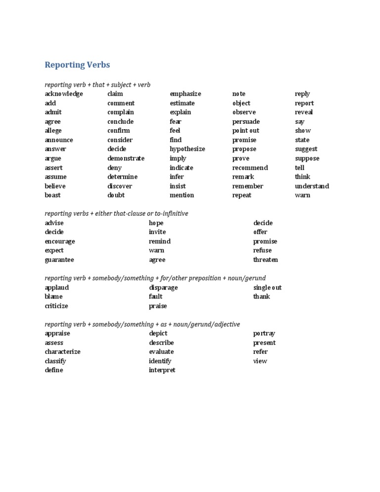 reporting verb + somebody/something + for/other preposition + noun/gerund