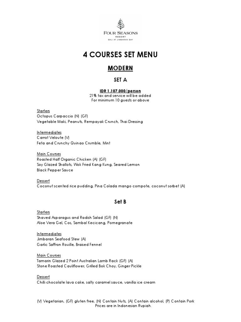 (V) Vegetarian, (GF) gluten free, (N) Contain Nuts, (A) Contain alcohol, (P) Contain Pork