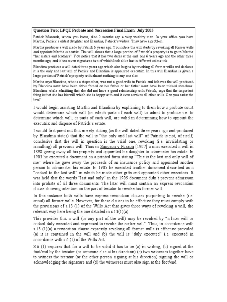 Question Two; LPQE Probate and Succession Final Exam: July 2005