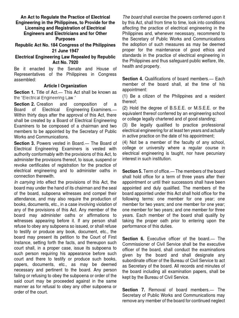 Electrical Engineering Law Repealed by Republic standards in the practice of electrical engineering in