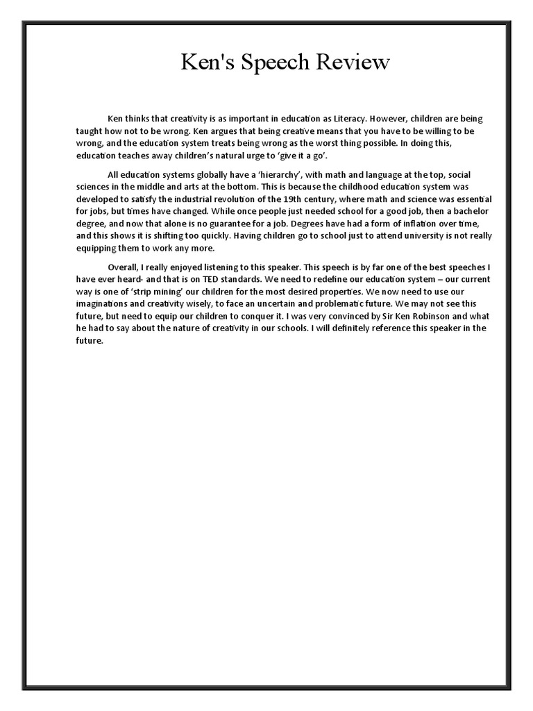he had to say about the nature of creativity in our schools. I will definitely reference this speaker in the