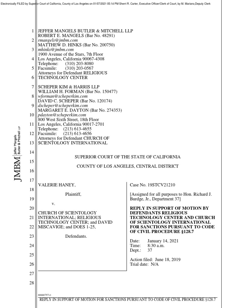 800 West Sixth Street, 18th Floor Los Angeles, California 90017-2701 Telephone: (213) 613-4655 Facsimile: (213) 613-4656 Attorneys for Defendant CHURCH OF SCIENTOLOGY INTERNATIONAL SUPERIOR COURT OF THE STATE OF CALIFORNIA COUNTY OF LOS ANGELES, CENTRAL DISTRICT VALERIE HANEY, Plaintiff, v. CHURCH OF SCIENTOLOGY INTERNATIONAL; RELIGIOUS TECHNOLOGY CENTER; and DAVID MISCAVIGE; and DOES 1-25, Defendants. Case No. 19STCV21210 [Assigned for all purposes to Hon. Richard J. Burdge, Jr., Department 37]