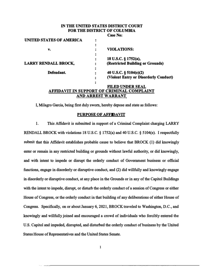 RENDALL BROCK with violations 18 U.S.C. § 1752(a) and 40 U.S.C. § 5104(e). I respectfully