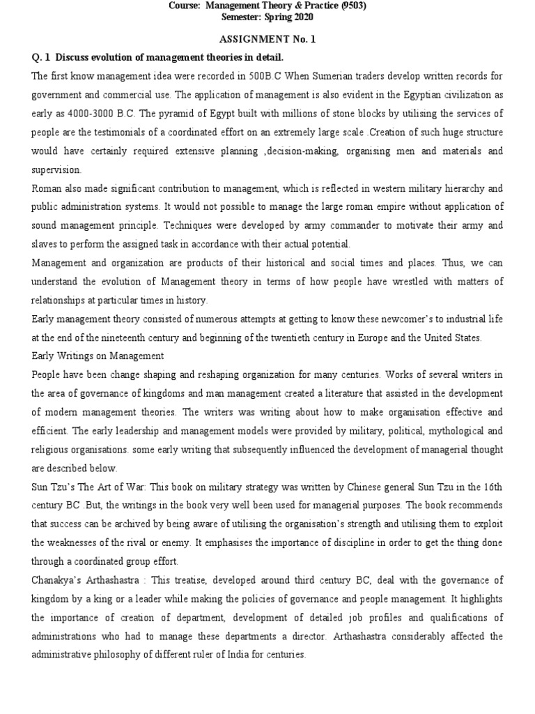 Assignment No. 1 Q. 1 Discuss Evolution of Management Theories in Detail